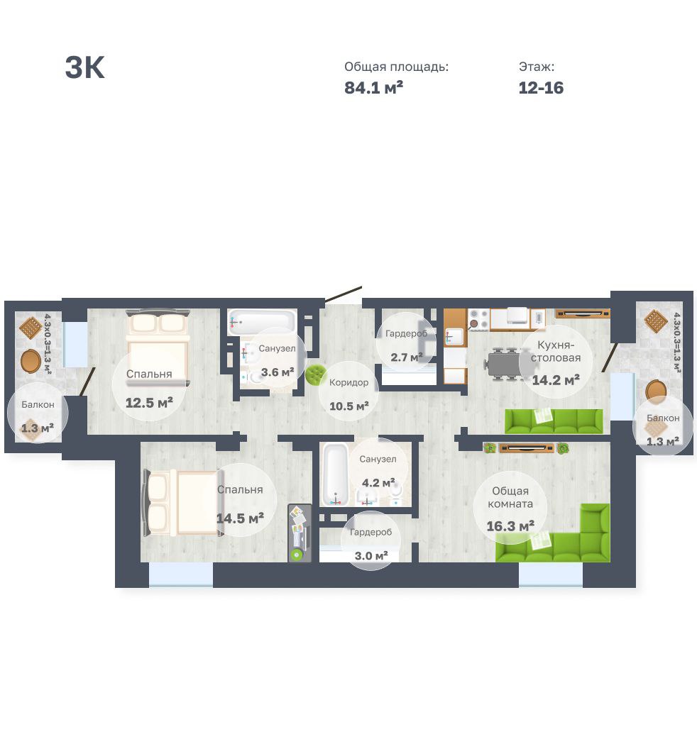 Трёхкомнатные 84.1м2