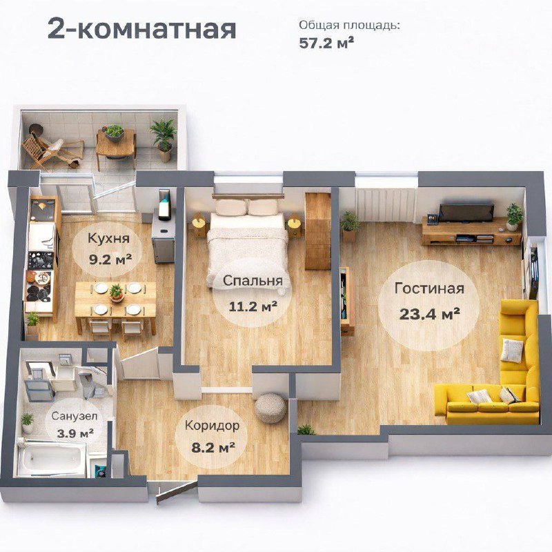 Площадь: 57.2м2